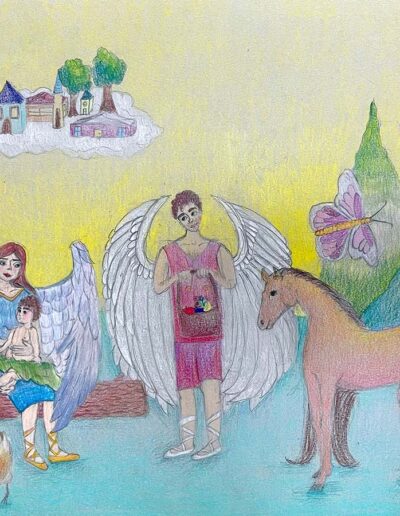 “Zbor printre nori”, creioane colorate, A3, 2025